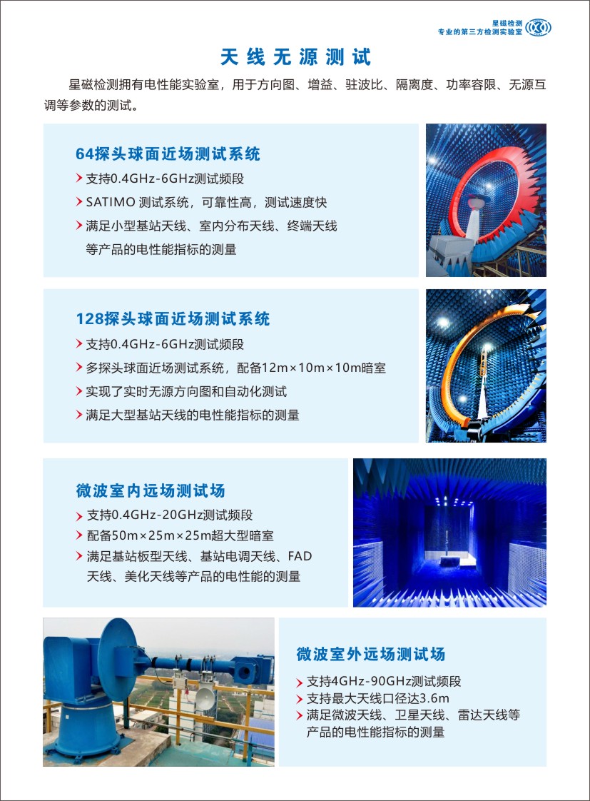 本系统使用的正是SATIMO的SG测试系统,可靠性高,测试速度快。支持400MHz至6GHz测试频段,被测天线只需水平旋转180°即可进行完整的3D测量。支持最大天线尺寸长达2.5米,最大重量达50公斤,能满足小型基站天线、室内分布天线、终端天线等产品的电性能指标的测量。