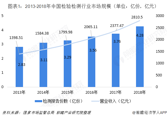 随着我国社会经济的发展,化工、机械、食品、纺织等工业整体规模扩大,产能和产量得到了迅速扩大,随着我国对产品质量要求的提高,各行业对检验检测的需求扩大,带动了我国检验检验检测市场规模的扩大。根据国家市场监管总局数据显示,2018年我国检验检测行业机构数量达到39472家,共出具检验检测报告4.28亿份,较2017年提高了13.83%,行业实现营业收入2810.5亿元,同比增长18.21%。