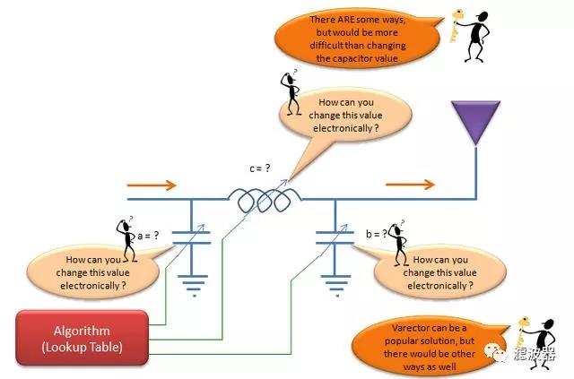 主要由于元件的可用性和其他一些原因,在大多数自动调谐电路中,我们使用可变电容器,如下所示。一旦你建立了一个电路,你可能需要为这些组件找到适合不同情况的正确值,并将这些值存储在一个查找表中,然后根据情况(频段或者频率信息)由控件控制查找表中的值。在这种情况下,如何为每种情况设定正确的查找表将是一个关键问题。