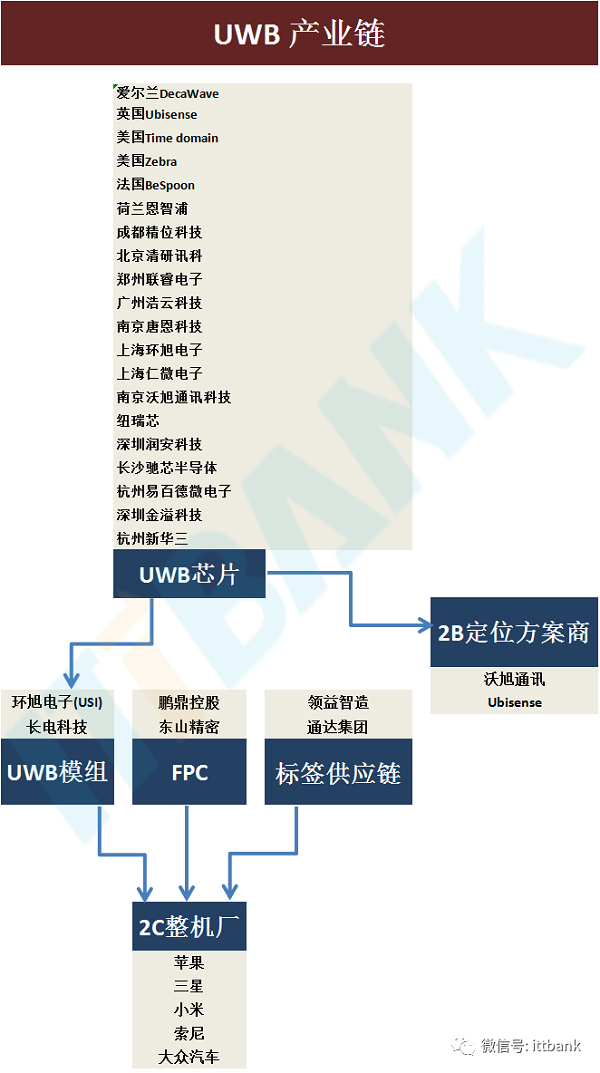本次小米支持UWB,尚不确认具体的产业链合作伙伴是哪些。国内目前宣称在做UWB的企业与如上厂家。值得一提的是,国内还有大量的中小型创业团队在从事UWB解决方案的开发,主要针对的就是室内高精度定位和智能家居、智能园区、智能厂房等场景。目前,除了苹果和小米之外,三星也非常看好UWB技术,认为其将成为下一代可以改变游戏规则的无线通信技术之一。正如小米在公开的技术演示中表现,在智能家居的应用场景下,UWB技术能够以手机为核心进行感知测距,最大程度降低了传统行业中对节点布网模式的依赖,可实现手机物联网遥控、智能开锁等功能。在该场景下,相对频繁调用智能家居控制软件,UWB技术的应用简化了用户与智能家居设备间的交互流程,对于智能家居系统来说,是一大创新应用。实际上,在手机的协助下,UWB技术可实现的功能还不止于此。据不完全统计,iphoness 11自2019年应用UWB技术以来,除了实现小米演示的“遥控+开智能门锁”功能以外,还有不少新功能。比如:1)协助AirDrop(即隔空投送)精准定位数据传输对象。iphoness 11上的AirDrop多了一项新功能,可以更具距离给周围的人排序,这样用户可以选择最近的人来传输数据。2)实时定位 Real-time locations。在没有GPS的场合,例如机场的地下停车场,UWB可以帮助定位,用户可以分享给网约车司机,告知自己的实时位置,这样帮助司机找到乘客。3)车钥匙CarKey。苹果在ioses14中推出CarKey功能,通过手机分享汽车钥匙给亲友,最初的合作伙伴是宝马,这其中就使用了超宽带UWB技术。据近期媒体披露,物件追踪设备将是苹果的下一个UWB技术应用。有报道称苹果计划今年上半年发布一种新的小型外设AirTags,具备UWB无线功能,贴在物体如手机、钱包、钥匙等物体上,通过手机上的Find My应用可方便寻找。综上来看,UWB技术的应用场景已经从传统行业解锁至智能家居、智能办公、智慧城市、智慧交通、消费电子等领域。立足于手机市场,UWB技术在消费类电子市场的应用爆发趋势开始凸显。据了解,2019年iphoness 11销量约为4000万部,即仅苹果一家在2019年已经带动4000万片UWB芯片的销量,这几乎达到了前些年行业UWB芯片的销量总和。2020年,随着三星 和小米先后宣布在手机中置入UWB技术,以手机为代表的消费级应用正面向UWB技术渐行渐近。早前有券商预计,UWB技术一旦成熟,市场应用空间或超千亿级,而在众多的应用领域中,消费级应用无疑是最具想象力的。