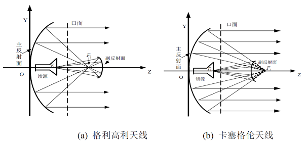 我们简单地了解一下双反射面系统,双反射面天线在卫星通信系统中应用很广,例如地面站,由于同时可对两个反射面进行整形,可以获得更加灵活的设计从而满足更多的参数需求,例如高的天线增益和严格的交叉极化规格。