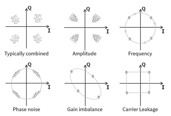 这两个项目测量 WLAN 信号的 EVM,以检查信号质量。EVM(误差向量幅度)是一个向量在理想的星座图上的点和由接收器接收的点之间的差异(包括幅度和相位的矢量)。星座图的详细信息请参阅本节末尾的专栏。由于 EVM 是一个会受上述测量结果(例如功率、频率、噪声等)影响的复合值,因此尽管 EVM 表现不佳也可以认为是由多种原因引起的,但它确实可以在评估 EVM 表现不佳的原因时发挥一定的作用,并提供一些关于应对措施的提示