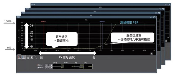 该项评估 WLAN 产品是否可以接收错误率位于容差范围内的微弱信号。错误率用一个称为分组差错率( PER) 的数值表示。PER 是指 DUT 无法接收的数据包(错误数据包)相对于从设备发送到 DUT 的固定数量数据包的百分比。测量人员会逐渐改变产品的输入信号功率(接入点和 WLAN 测试仪发射信号)并绘制 PER 图表,以找出当 PER 低于某个固定值时所对应的功率,也就是最小功率(最小输入电平灵敏度)。如果此最小输入电平灵敏度低于 IEEE 标准所规定的值,则表明 WLAN 产品满足 IEEE 标准。在通信过程中,最小输入电平灵敏度由多种参数决定,例如调制方式、编码率、信道间隔等。在此项评估中,手动绘制每个参数的功率与 PER之间的关系需要花费很长时间。