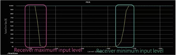 该项测量并评估最大输入电平灵敏度。与2-1节的最小输入灵敏度电平标准不同,此处将逐渐增大输入功率,以评估在有一些预知错误的情况下能否在标准化输入功率范围内接收到信号。标准要求在接收灵敏度的 PER(指数)为 10% 和 8%(或以下)时能够接收到信号。就像之前所述的评估那样,该测试会绘制输入功率与 PER 之间的关系图。这些由相应标准作为不同的调制方式、编码率、信道间隔等来决定。